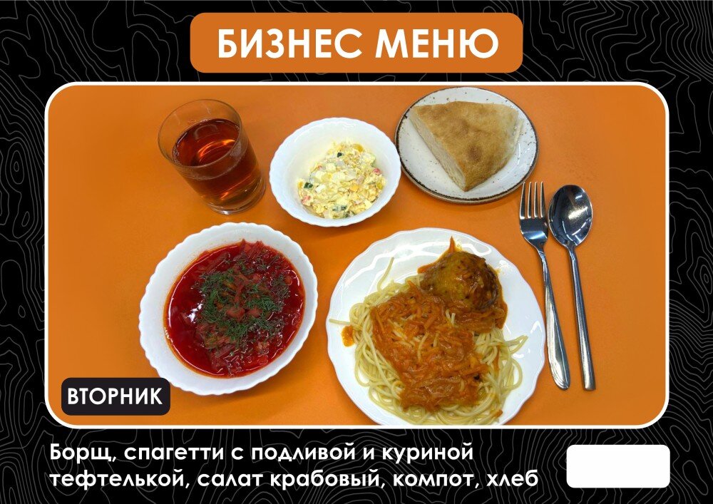 Борщ, с говядиной .Спагетти с подливой и куриной тефтелькой Салат крабовый компот из сухофруктов