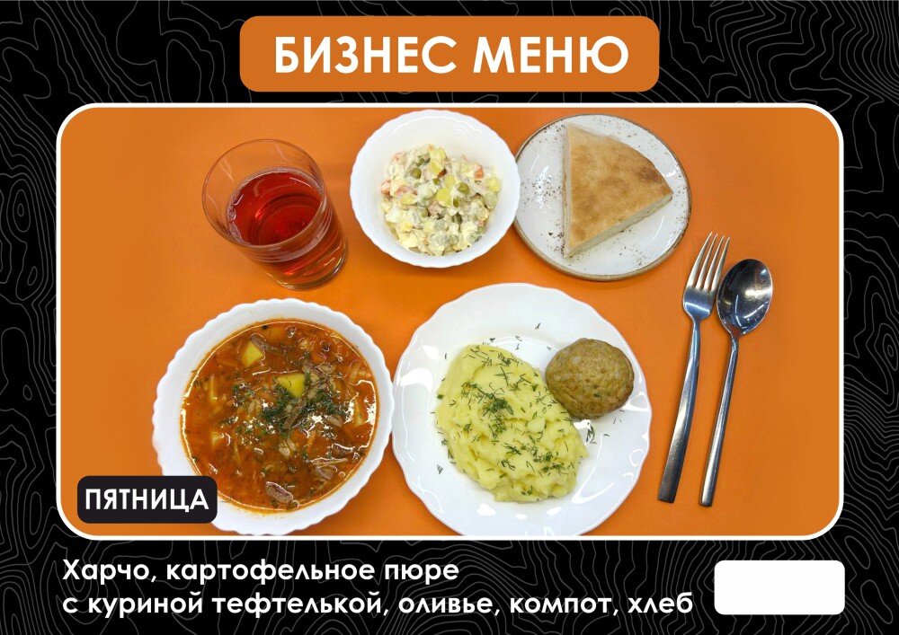 Харчо Картофельное пюре с куриной тефтелькой салат Оливье компот